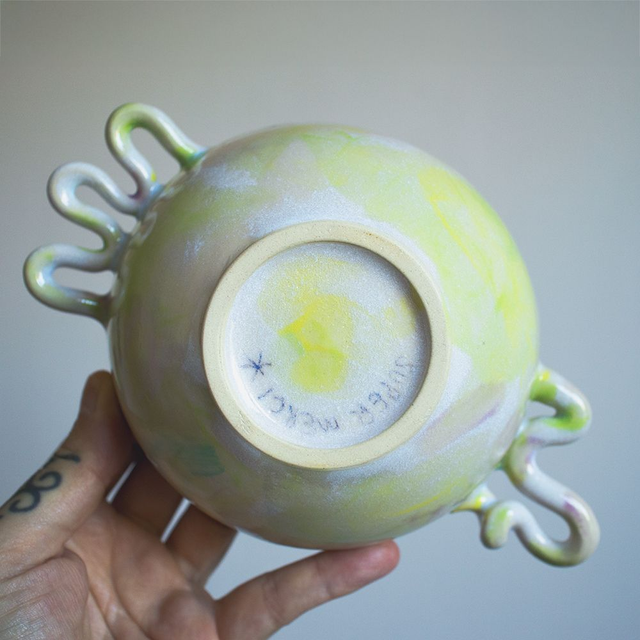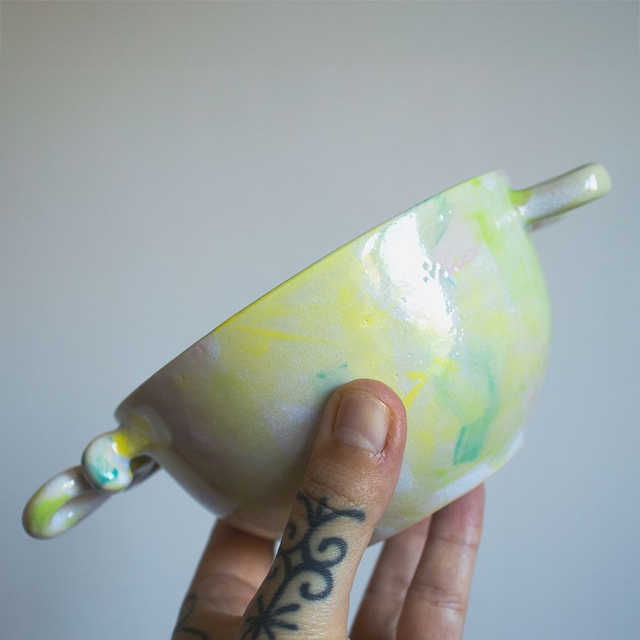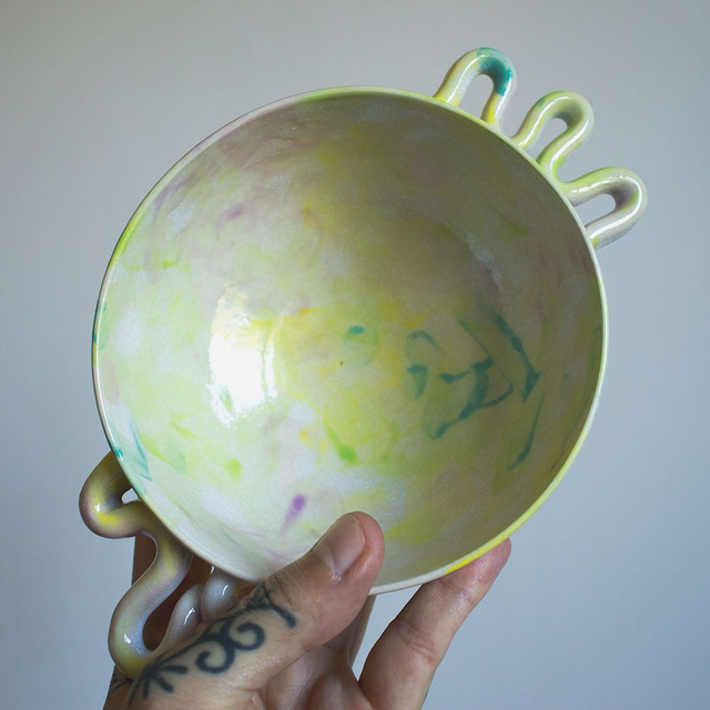 Bol à doubles anses biscornues, multicolore, émail brillant.