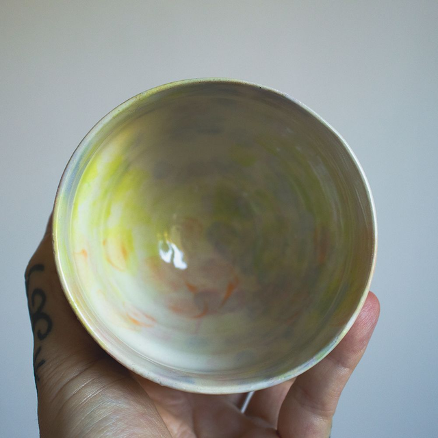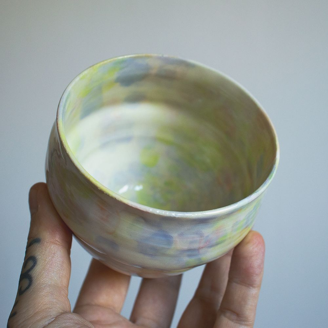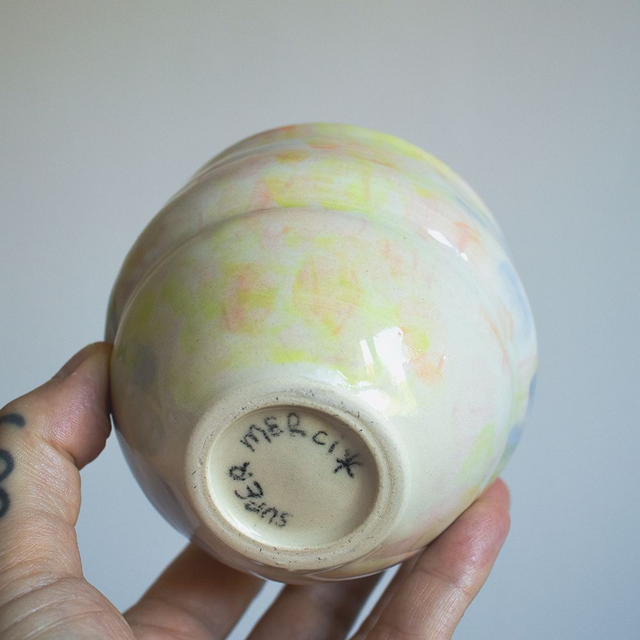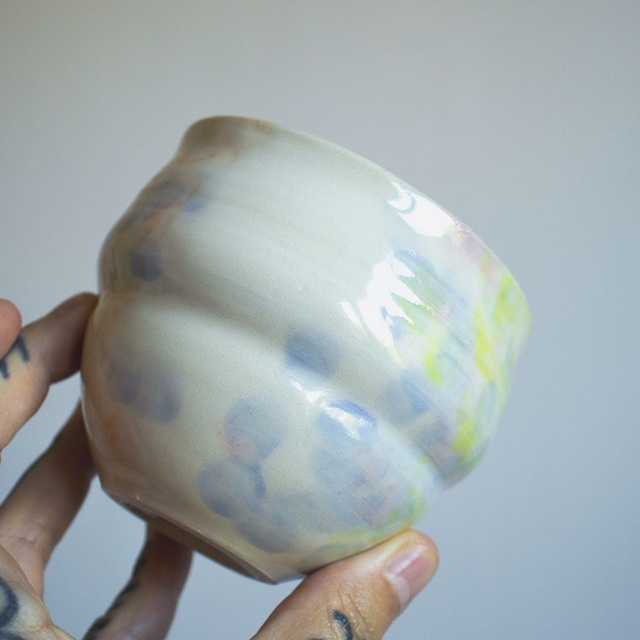 Gobelet forme à vagues, multicolore, émail transparent et brillant.