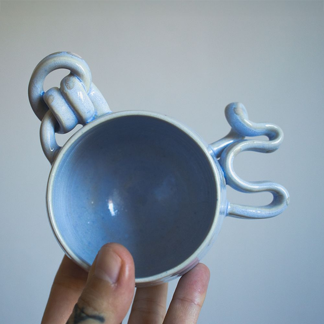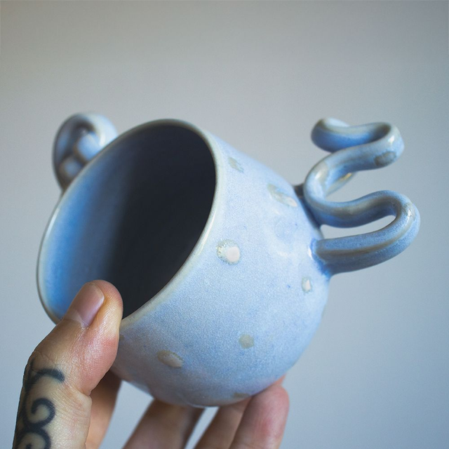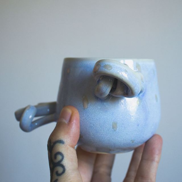 Tasse baby blue, doubles anses biscornues, poids beiges rosés