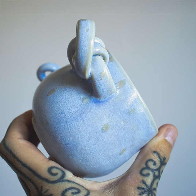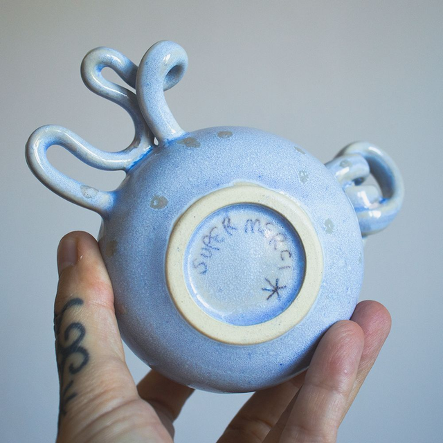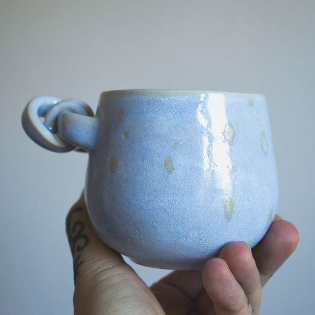 Tasse baby blue, poids beiges rosés, émail brillant. Doubles anses biscornues.